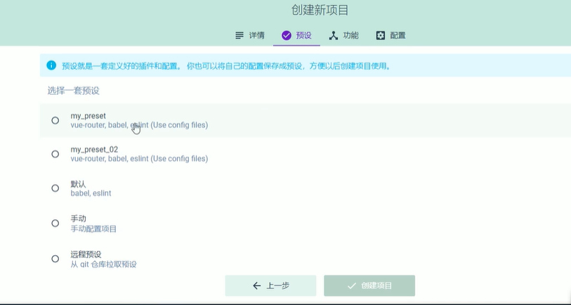 4.预设新项目(可选择之前创建过的项目)或者手动配置