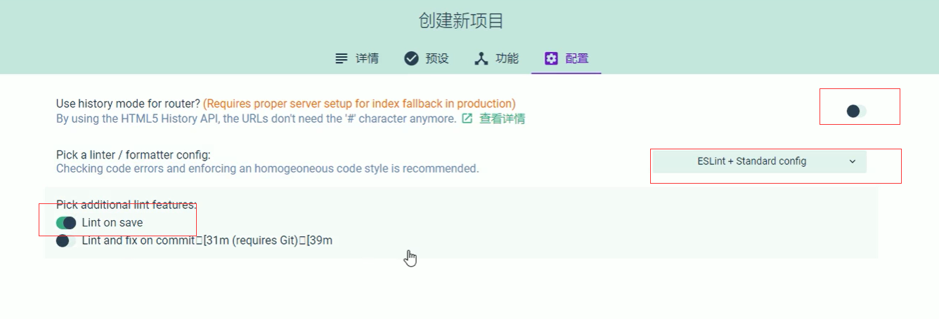功能页下,手动配置功能有Bable,Router,Linter/Formatter,使用配置文件