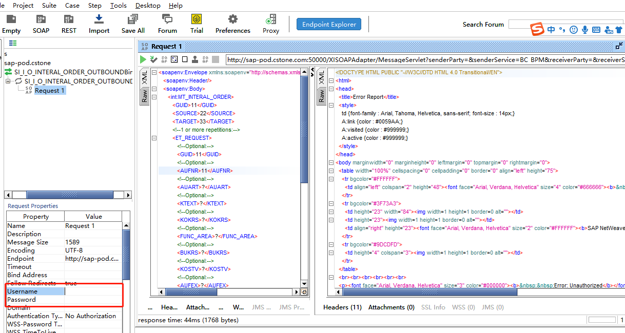 如图所示 SOAP中测试PO接口如果没有维护好用户名密码那么在测试的时候会报错。