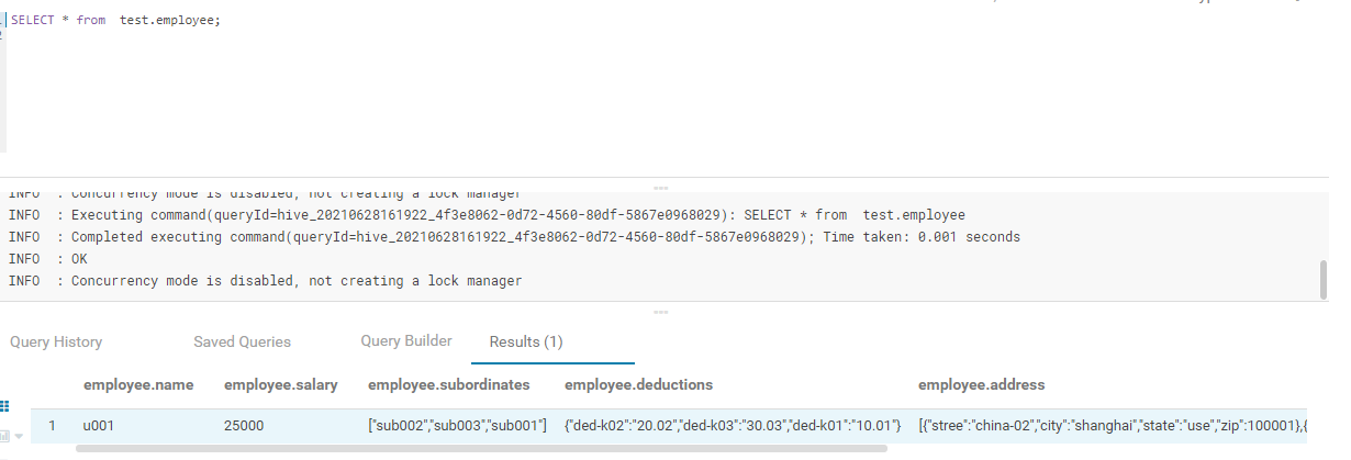 SELECT * from test.employee; employee.name employee.salary employee.subordinates employee.deductions u001 25000 ["sub002","sub003","sub001"] {"ded-k02":"20.02","ded-k03":"30.03","ded-k01":"10.01"} employee.address [{"stree":"china-02","city":"shanghai","state":"use","zip":100001},{"stree":"china-03","city":"lanzhou","state":"use","zip":100002},{"stree":"china","city":"beijing","state":"use","zip":100000}]