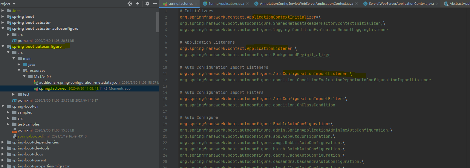PS: spring.factories文件一般由spring-boot-autoconfigure 子模块中的WEB-INF目录下,是一种SPI机制的实现方式,spring-boot-autoconfigure是SpringBoot实现自动装配的基础,同时也是spring-boot-starter的依赖,间接属于各个starter的简介依赖