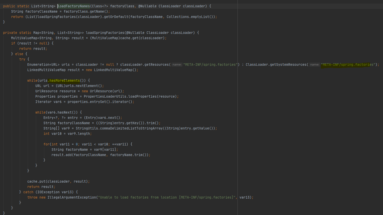 Set<String> names = new LinkedHashSet<>(SpringFactoriesLoader.loadFactoryNames(type, classLoader));
