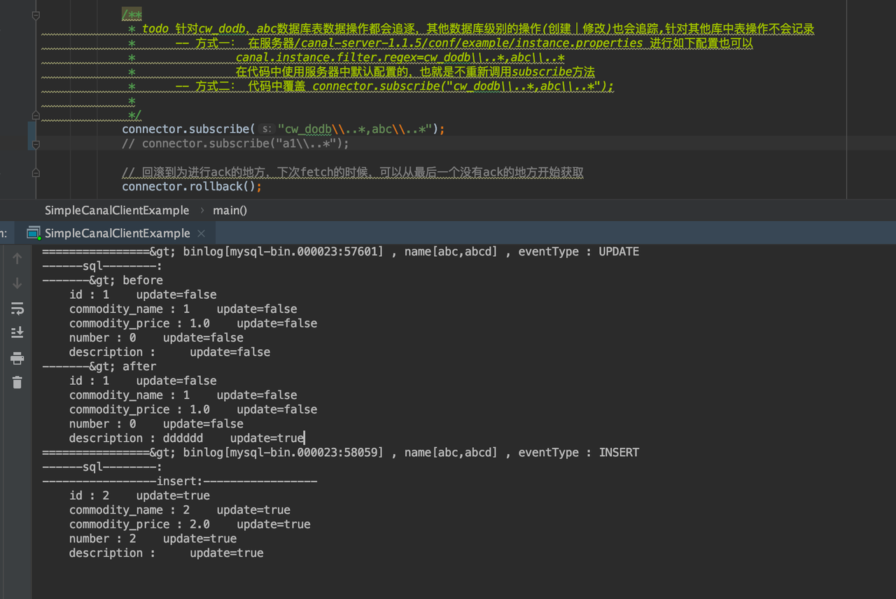 public class SimpleCanalClientExample { public static void main(String[] args) { // 创建链接 CanalConnector connector = CanalUtils.getLocalCanalConnector(); int batchSize = 1000; int emptyCount = 0; int dataCount = 0; try { // 打开链接 connector.connect(); // todo 订阅数据库表,全部表 // connector.subscribe(".*\\..*"); /** * todo 针对cw_dodb,abc数据库表数据操作都会追逐,其他数据库级别的操作(创建|修改)也会追踪,针对其他库中表操作不会记录 * -- 方式一: 在服务器/canal-server-1.1.5/conf/example/instance.properties 进行如下配置也可以 * canal.instance.filter.regex=cw_dodb\\..*,abc\\..* * 在代码中使用服务器中默认配置的,也就是不重新调用subscribe方法 * -- 方式二: 代码中覆盖 connector.subscribe("cw_dodb\\..*,abc\\..*"); * */ // connector.subscribe("cw_dodb\\..*,abc\\..*"); connector.subscribe("a1\\..*"); // 回滚到为进行ack的地方,下次fetch的时候,可以从最后一个没有ack的地方开始获取 connector.rollback(); while (true) { // 获取指定数量的数据 Message message = connector.getWithoutAck(batchSize); // 获取批量ID long batchId = message.getId(); // 获取批量的数量 int size = message.getEntries().size(); // 如果没有数据的处理逻辑 if (batchId == -1 || size == 0) { emptyCount++; // System.out.println("empty count : " + emptyCount); try { Thread.sleep(1000); } catch (InterruptedException e) { } } else { // 有数据的处理emptyCount = 0; dataCount++; // System.out.printf("message[batchId=%s,size=%s] \n", batchId, size); printEntry(message.getEntries()); } // 提交确认,标记ack connector.ack(batchId); System.out.println("---handled data counts: "+dataCount); // 处理失败, 回滚数据 // connector.rollback(batchId); } } finally { connector.disconnect(); } } /** * 打印canal server解析binlog获取的实体类信息 * @param entrys */ private static void printEntry(List<Entry> entrys) { for (Entry entry : entrys) { if (entry.getEntryType() == EntryType.TRANSACTIONBEGIN || entry.getEntryType() == EntryType.TRANSACTIONEND) { // 开启/关闭事务的实体类型,跳过 continue; } /** * RowChange对象,包含了一行数据变化的所有特征 * 比如isDdl 是否是ddl变更操作 sql 具体的ddl sql beforeColumns afterColumns 变更前后的数据字段等等 */ RowChange rowChage = null; try { rowChage = RowChange.parseFrom(entry.getStoreValue()); } catch (Exception e) { throw new RuntimeException("ERROR ## parser of eromanga-event has an error , data:" + entry.toString(), e); } // 获取针对Mysql数据操作类型:insert/update/delete EventType eventType = rowChage.getEventType(); // 打印Header信息 System.out.println(String.format("================> binlog[%s:%s] , name[%s,%s] , eventType : %s", entry.getHeader().getLogfileName(), entry.getHeader().getLogfileOffset(), entry.getHeader().getSchemaName(), entry.getHeader().getTableName(), eventType)); // 判断是否是DDL语句 if(rowChage.getIsDdl()){ System.out.println("================》;isDdl: true,sql: " + rowChage.getSql()); } List<RowData> rowDatasList = rowChage.getRowDatasList(); if(!CollectionUtils.isEmpty(rowDatasList)) { // todo 如果不是DDL的话获取不到原始sql语句,只能通过数据组装成SQL String sql = rowChage.getSql(); System.out.println("------sql--------: "+sql); // 获取RowChange对象里的每一行数据,打印出来 for (RowData rowData : rowChage.getRowDatasList()) { if (eventType == EventType.DELETE) { System.out.println("----------------delete:----------------"); printColumn(rowData.getBeforeColumnsList()); } else if (eventType == EventType.INSERT) { System.out.println("-----------------insert:-----------------"); printColumn(rowData.getAfterColumnsList()); } else { System.out.println("-------> before"); printColumn(rowData.getBeforeColumnsList()); System.out.println("-------> after"); printColumn(rowData.getAfterColumnsList()); } } } } } private static void printColumn(List<Column> columns) { for (Column column : columns) { System.out.println("\t"+column.getName() + " : " + column.getValue() + " update=" + column.getUpdated()); } } }
