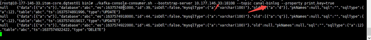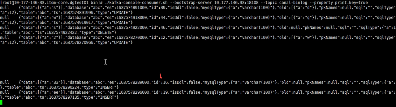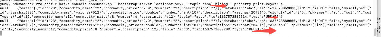 kafka-console-consumer.sh --bootstrap-server localhost:9092 --topic canal-binlog --property print.key=true null {"data":[{"id":"aba1b95e24dd4434909177c2c14f3020","commodity_name":"1","commodity_price":"3.0","number":"3","description":"79d9782c3d174c918fe64ef66d1bc039"}],"database":"abc","es":1637560518000,"id":5,"isDdl":false,"mysqlType":{"id":"varchar(32)","commodity_name":"varchar(512)","commodity_price":"double","number":"int(10)","description":"varchar(2048)"},"old":[{"commodity_name":"desc1"}],"pkNames":["id"],"sql":"","sqlType":{"id":12,"commodity_name":12,"commodity_price":8,"number":4,"description":12},"table":"abc","ts":1637560518949,"type":"UPDATE"} null {"data":[{"id":"d26eea16687a40e2be925cae162c9bd3","commodity_name":"2","commodity_price":"1.0","number":"1","description":"e8023b930e384692978af8a7af4ea6f6"}],"database":"abc","es":1637560526000,"id":6,"isDdl":false,"mysqlType":{"id":"varchar(32)","commodity_name":"varchar(512)","commodity_price":"double","number":"int(10)","description":"varchar(2048)"},"old":[{"commodity_name":"desc1"}],"pkNames":["id"],"sql":"","sqlType":{"id":12,"commodity_name":12,"commodity_price":8,"number":4,"description":12},"table":"abc","ts":1637560526294,"type":"UPDATE"} null {"data":[{"id":"d26eea16687a40e2be925cae162c9bd3","commodity_name":"2","commodity_price":"1.0","number":"1","description":"e8023b930e384692978af8a7af4ea6f6"}],"database":"abc","es":1637560726000,"id":7,"isDdl":false,"mysqlType":{"id":"varchar(32)","commodity_name":"varchar(512)","commodity_price":"double","number":"int(10)","description":"varchar(2048)"},"old":null,"pkNames":["id"],"sql":"","sqlType":{"id":12,"commodity_name":12,"commodity_price":8,"number":4,"description":12},"table":"abc","ts":1637560726484,"type":"DELETE"} null {"data":[{"id":"wwwwww","commodity_name":"1","commodity_price":"0.0","number":"0","description":"wwwww"}],"database":"abc","es":1637560787000,"id":8,"isDdl":false,"mysqlType":{"id":"varchar(32)","commodity_name":"varchar(512)","commodity_price":"double","number":"int(10)","description":"varchar(2048)"},"old":null,"pkNames":["id"],"sql":"","sqlType":{"id":12,"commodity_name":12,"commodity_price":8,"number":4,"description":12},"table":"abc","ts":1637560787488,"type":"INSERT"}