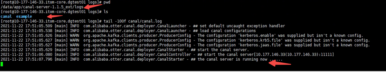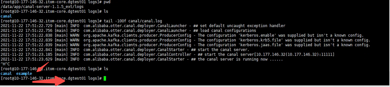 canal服务器日志文件目录 cd /data/app/canal-server-1.1.15/logs/canal example实例日志文件目录 cd /data/app/canal-server-1.1.15/logs/example