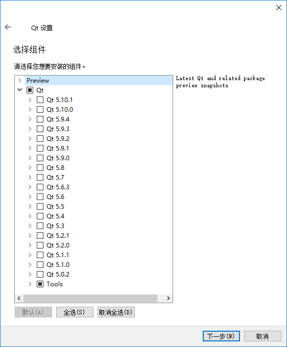 有选择地下载 Qt 组件,选择相应的 Qt 版本和 Qt Creator。例如 Qt 5.10.1 下的内容不需要全都下载,按照需求下载即可。