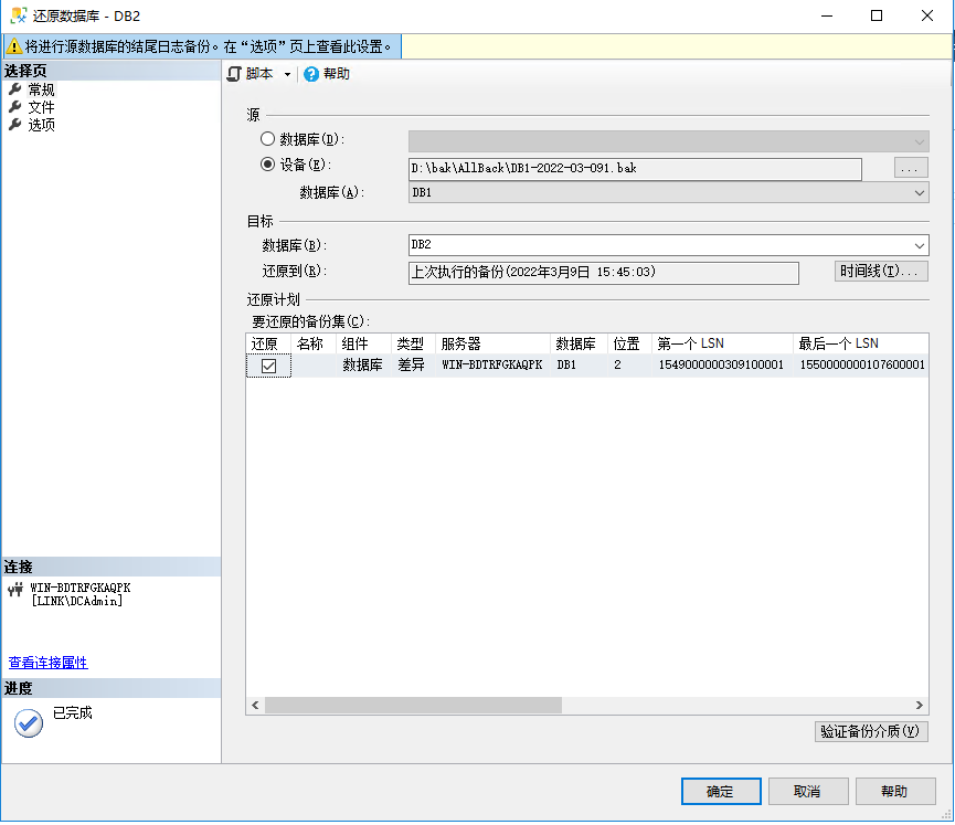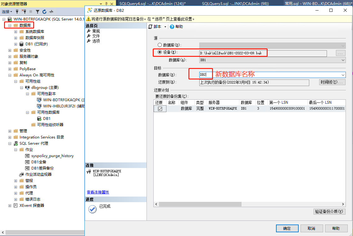 1)数据库—还原数据库,选择源设备,选择备份的文件,修改新的数据库名称为DB2。