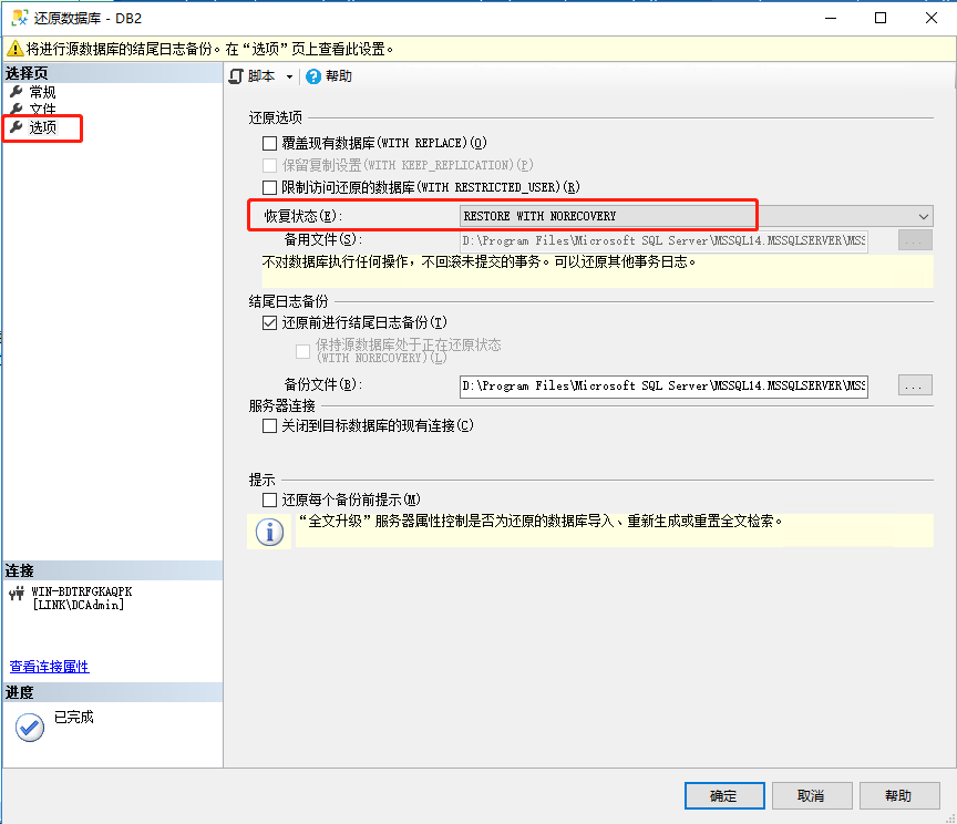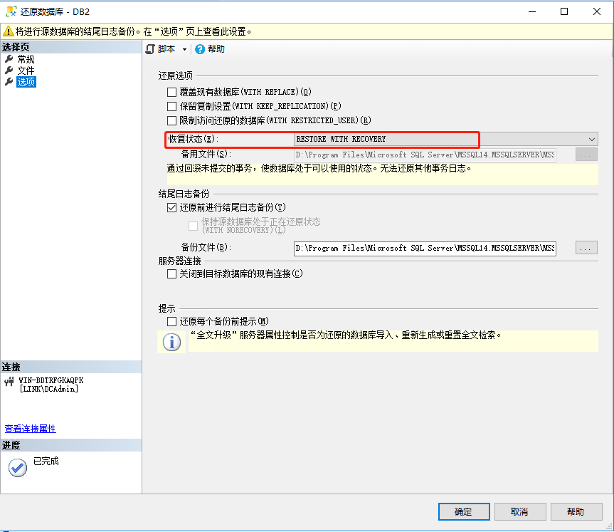 2)恢复状态选择“使数据库处于可使用的状态”。