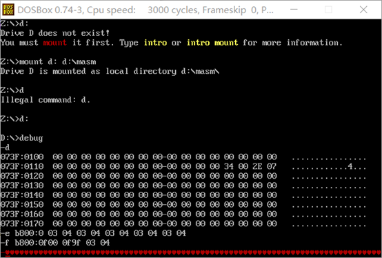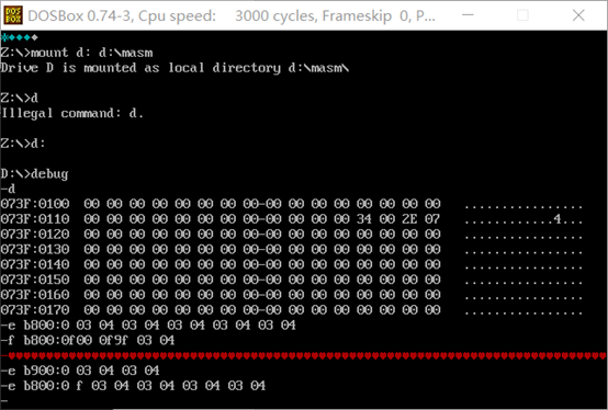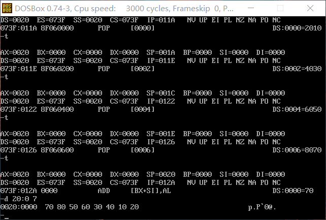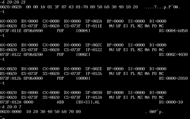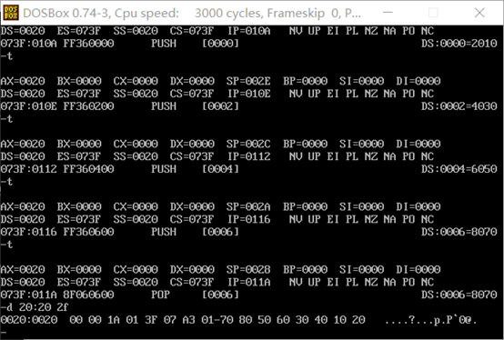 问题2:00220H ~ 0022fH被设置为栈空间,在使用 t 指令时单步执行指令从而引发了中断,而且在中断时进行保护,将接下来执行的命令存放在栈中。