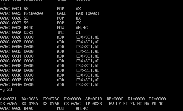 ① 根据call指令的跳转原理,先从理论上分析,程序执行到退出(line31)之前,寄存器(ax) = 0021h 寄存器 (bx) = 0026h 寄存器(cx) = 076ch