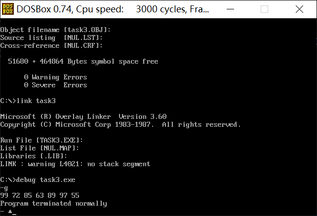 assume cs:code, ds:data data segment x db 99, 72, 85, 63, 89, 97, 55 len equ $- x data ends code segment start: mov ax,data mov ds,ax mov si,offset x mov cx,len s:mov ah,0 mov al,[si] mov bl,10 div bl;用ax中的数字除以10,商在al中,余数在ah中mov dx,ax call printNumber call printSpace inc si loop s mov ah,4ch int 21h printNumber: mov dx,ax add dx,3030h;数字与字符串之间ascll码值的关系,将数字->字符 mov ah,2;输出字符 int 21h mov ah,2 mov dl,dh int 21h ret printSpace: mov dl,' ' int 21h ret code ends end start