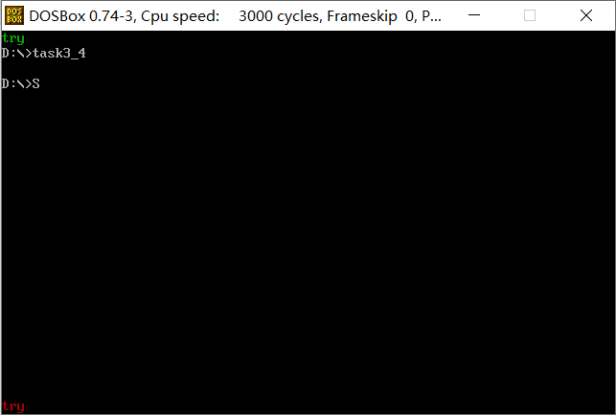 assume cs:code, ds:data data segment str db 'try',0 len equ $ - str data ends code segment start: mov dh,1 ;设置行数 mov dl,0 ;设置列数 mov cl,2 ;设置颜色 mov ax,data mov ds,ax mov si,0 call show_str mov dh,25 ;重置行列数和颜色 mov dl,0 mov cl,4 call show_str mov ax,4c00h int 21h show_str: push cx push si mov ax,0b800h mov es,ax mov al,0a0h dec dh mul dh mov bx,ax mov al,2 mul dl sub dl,2 add bx,ax ;得到现实的偏移位置 mov di,0 mov ch,0 mov al,cl s: mov cl,ds:[si] jcxz next :判断最后一个字符是否为零,如果是零则结束 mov es:[bx+di],cl ;字符串放到前面 mov es:[bx+di+1],al ;颜色放到后面 add di,2 inc si jmp s next: pop si pop cx ret code ends end start