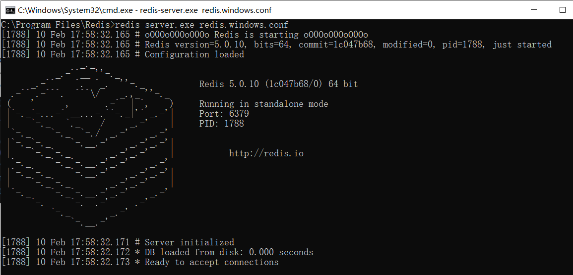 安装目录下,输入运行命令行:redis-server.exe redis.windows.conf