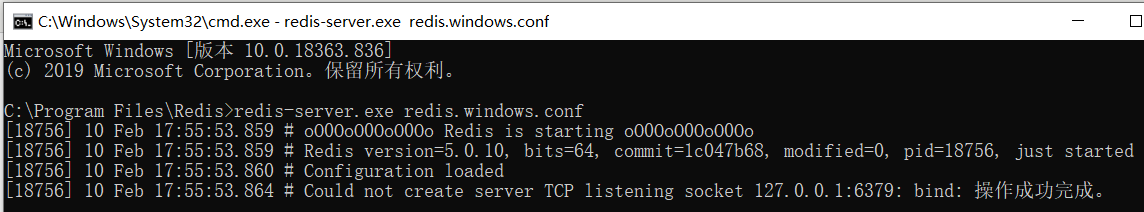 [18756] 10 Feb 17:55:53.864 # Could not create server TCP listening socket 127.0.0.1:6379: bind: 操作成功完成。