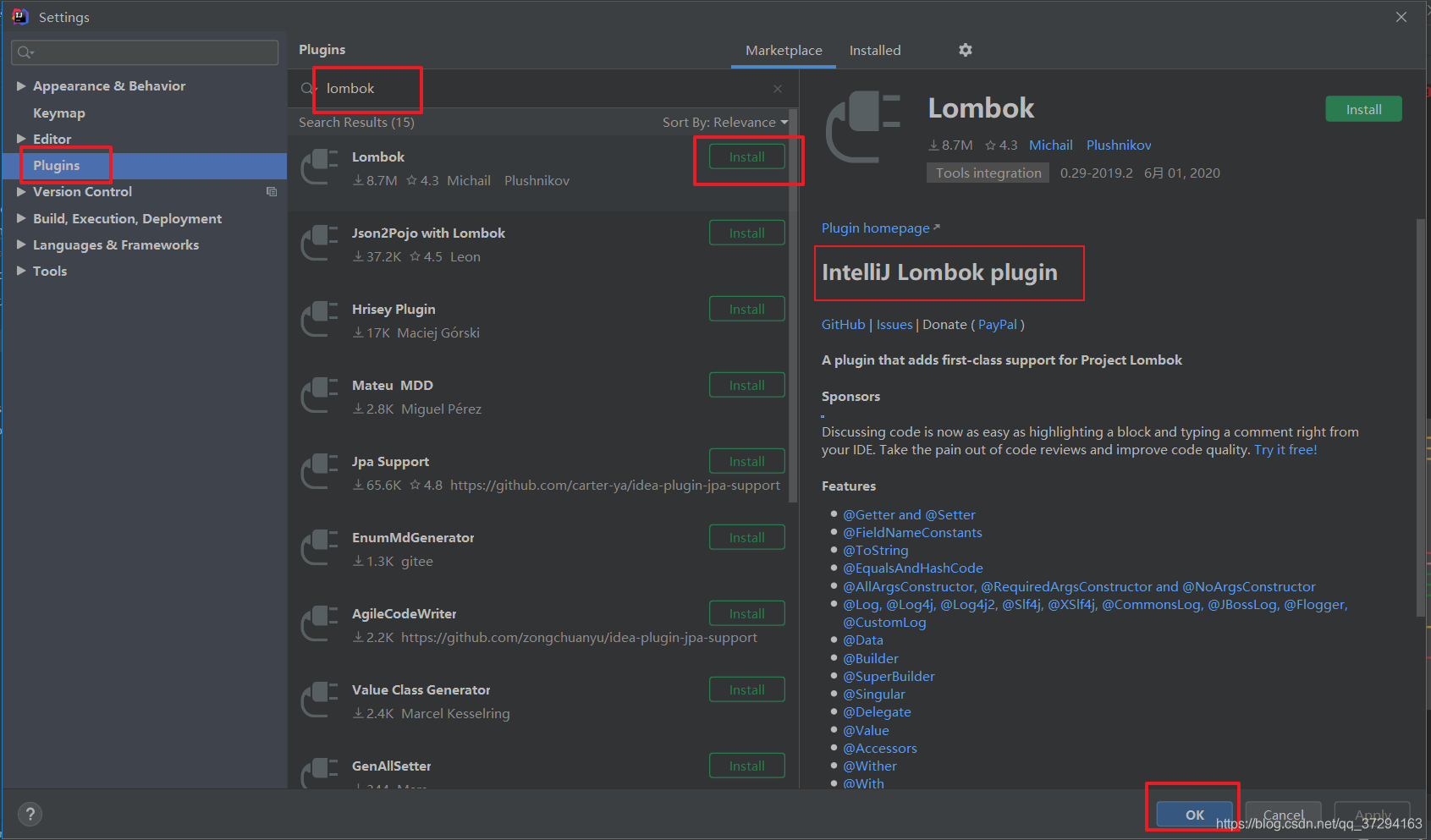 1、安装lombok插件,点击菜单栏中的【File】->【Setting】->【Plugins】-> 输入 lombok ,【install】-> 【Ok】