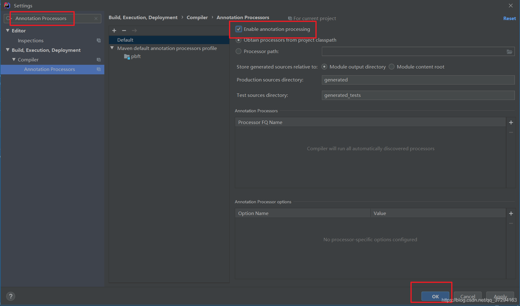 2、允许插件运行, 点击菜单栏中的【File】->【Setting】->搜索框直接输入【Annotation Processors】-> 将 Enable Annotation Processors 打勾,重启软件即可。