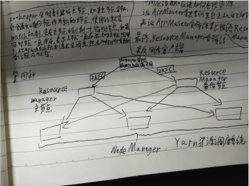 首先,分布式计算框架中新增了一台resourcemanage,用来当做备份,防止因为主机宕机而导致整个集群无法工作,那么他是怎么实现的呢,我们看下图