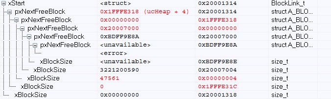 pxBlock(未分配的block的开始)表示当前的block从0x1FFFE318开始,blocksize 12276,下一个block地址是0x20001308,大小是0(即末尾block
