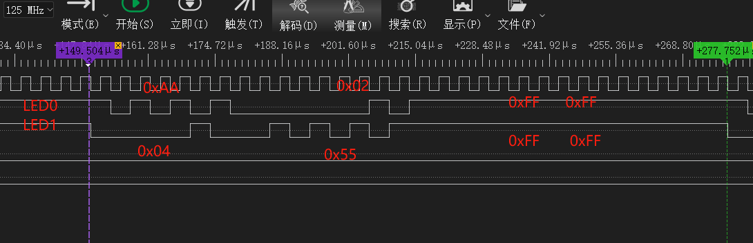 如数据是 __attribute__((__aligned__(4))) uint32_t tx_data[2] = {0x550204AA,0xFFFFFFFF} 则波形如下