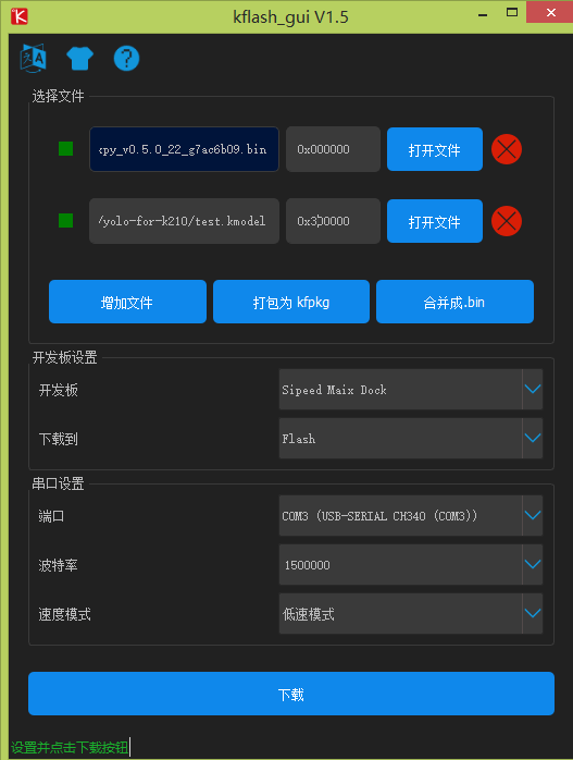 按照接下来步骤应该将之前生成的kmodel同样地用kflash烧录进去,地址设为0x300000(5个零!),但烧录进去后,发现MaixPy IDE连不上MCU了,于是只得把MaixPy重新刷一遍才能重新连上,可见,把kmodel直接烧进板子的flash是不行的!这个问题怎么解决呢,查找了多个blog,有人提到要把MaixPy与kmodel一起烧进flash,并设置不同的地址,抱着试一试的想法,我在kflash工具中先加入MaixPy文件,地址为0x000000,如下图