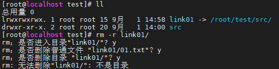 这时候,虽然软链接没有被删除,但是里面的文件被删除了。所以删除软链接的时候要特别注意,文件夹最后不要加"/"。
