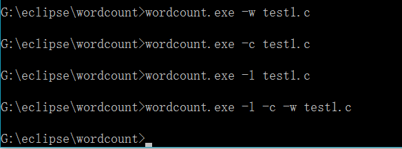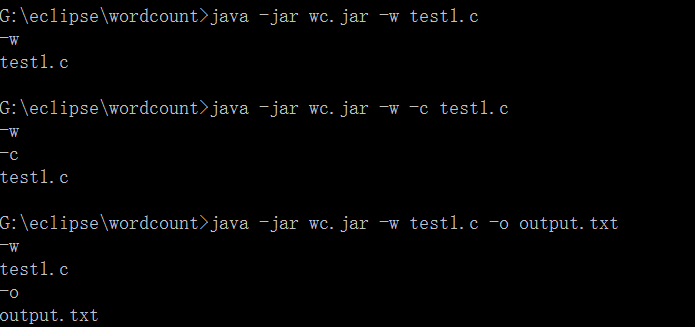 //计数方法 public static void calculate(File filename) throws IOException { InputStreamReader f=null; int charCaculate=0; int wordCaculate=0; int lineCaculate=0; try { f=new InputStreamReader(new FileInputStream(filename)); BufferedReader page = new BufferedReader(f); while(page.read()!=-1) { String lineWords=page.readLine(); charCaculate=charCaculate+lineWords.length(); wordCaculate=wordCaculate+lineWords.split("").length; lineCaculate=lineCaculate+1; } f.close(); }catch(IOException e) { e.printStackTrace(); } if(cFlag) { String o="文件名:"+filename.getName()+",字符数:"+charCaculate+"\r\n"; outStream.write(o.getBytes()); } if(wFlag) { String o2="文件名:"+filename.getName()+",字符数:"+wordCaculate+"\r\n"; outStream.write(o2.getBytes()); } if(lFlag) { String o3="文件名:"+filename.getName()+",字符数:"+lineCaculate+"\r\n"; outStream.write(o3.getBytes()); } } //根据flag调用 public void countWords(Vector<String> argsList) throws IOException{ if(argsList.contains("-c")) {cFlag=true;calculate(filePath);} if(argsList.contains("-w")) {wFlag=true;calculate(filePath);} if(argsList.contains("-l")) {lFlag=true;calculate(filePath);} }