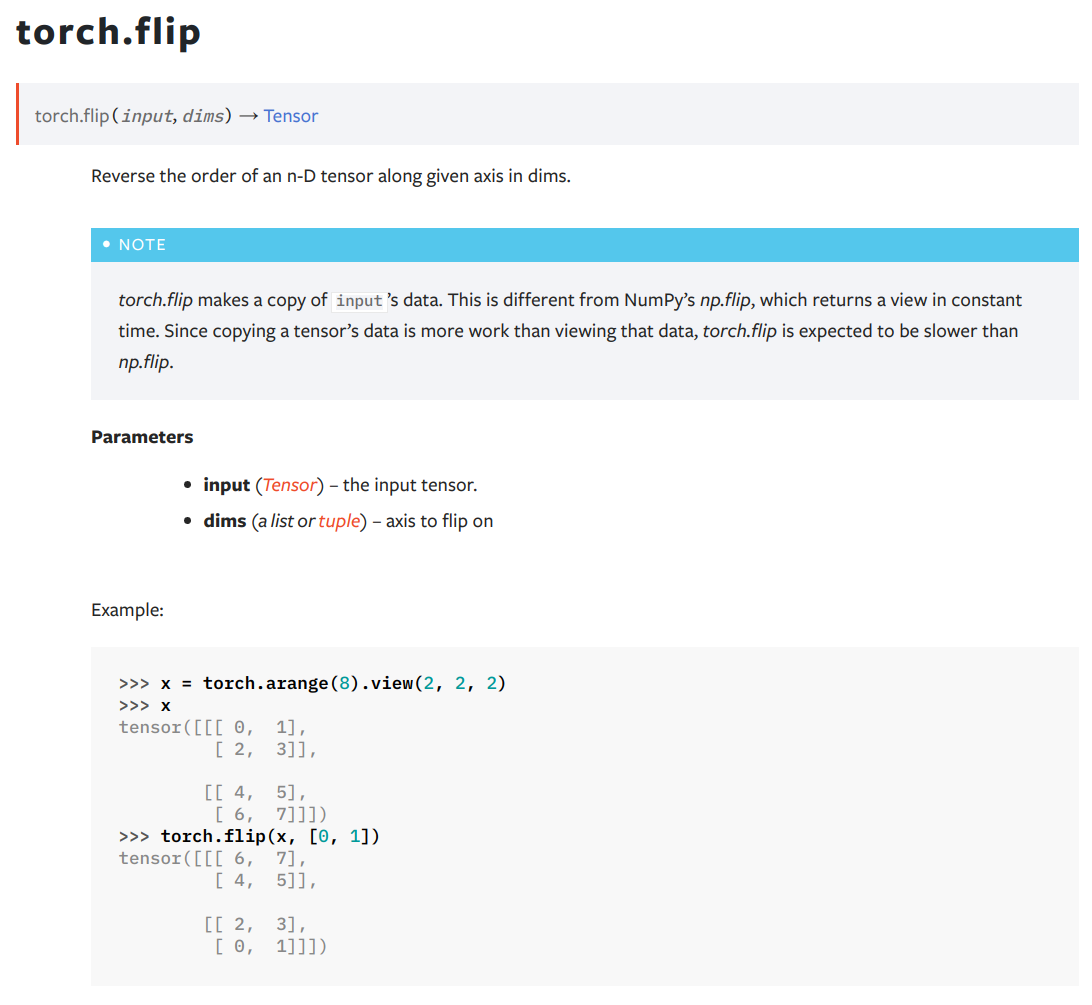 函数,用于执行Tensor的逆序操作,这需要我们指定相应的需要逆序的维度。注意区分于clip函数,clip函数是用来做大小裁切的,flip函数是用来做张量逆序的。flip函数的相关文档如下所示: