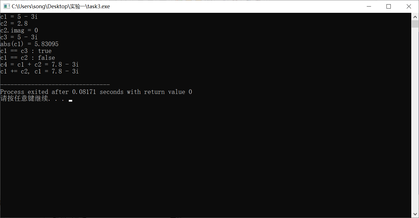 #include "Complex.hpp" #include <iostream> int main() { using namespace std; Complex c1(5, -3); const Complex c2(2.8); Complex c3(c1); cout << "c1 = "; c1.show(); cout << endl; cout << "c2 = "; c2.show(); cout << endl; cout << "c2.imag = " << c2.get_imag() << endl; cout << "c3 = "; c3.show(); cout << endl; cout << "abs(c1) = "; cout << abs(c1) << endl; cout << boolalpha; cout << "c1 == c3 : " << is_equal(c1, c3) << endl; cout << "c1 == c2 : " << is_equal(c1, c2) << endl; Complex c4; c4 = add(c1, c2); cout << "c4 = c1 + c2 = "; c4.show(); cout << endl; c1.add(c2); cout << "c1 += c2, " << "c1 = "; c1.show(); cout << endl; }