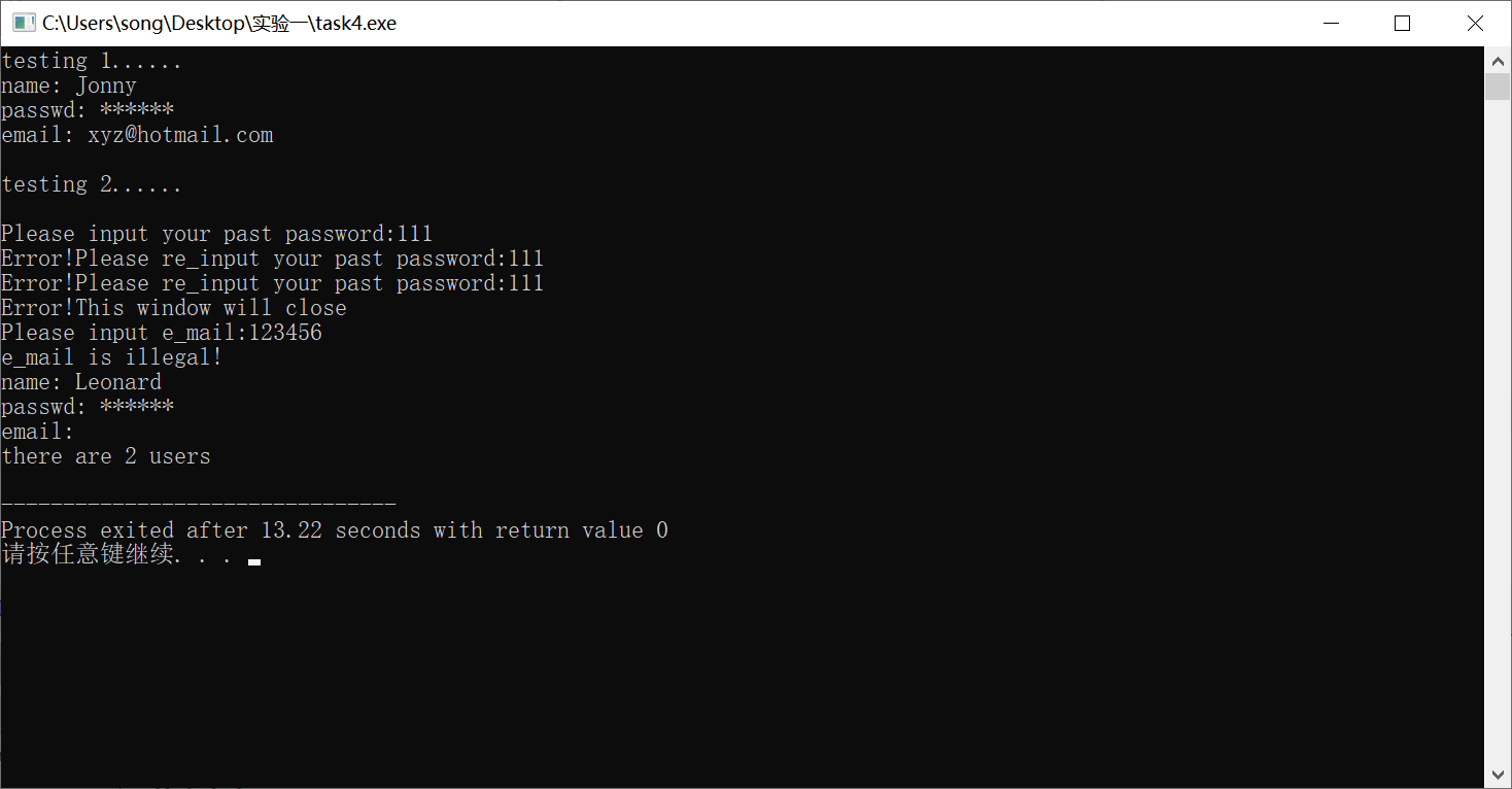 #ifndef USER_HPP #define USER_HPP #include <iostream> #include <string> using namespace std; class User{ public: User(string nn,string p="111111",string e=""){ name = nn; passwd = p; email = e; n++; } void set_email(); void change_passwd(); void print_info(); static void print_n(){ cout << "there are " << n << " users" <<endl; } private: string name; string passwd; string email; static int n; }; void User::set_email(){ string a; cout << "Please input e_mail:"; cin >> a; if(a.find('@')!=string::npos){ cout << "Set e_mail success!" << endl; email = a; }else { cout << "e_mail is illegal!" << endl; } } void User::change_passwd(){ cout << "Please input your past password:"; int flag=0; for (int i=0;i<3;i++){ string a; cin >> a; if(a==passwd){ flag=1; break; }else if(i<2){ cout << "Error!Please re_input your past password:"; } } if(flag){ cout << "Passwd right!Please input your new password:"; cin >> passwd; cout << "Change success!" << endl; }else { cout << "Error!This window will close" <<endl; } } void User:: print_info(){ cout << "name: " << name <<endl; cout << "passwd: " << "******" << endl; cout << "email: " << email <<endl; } int User::n = 0; #endif
