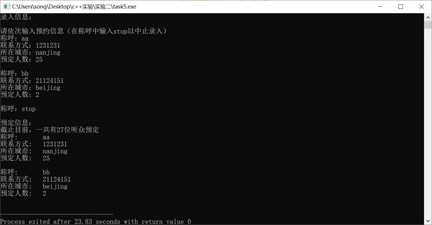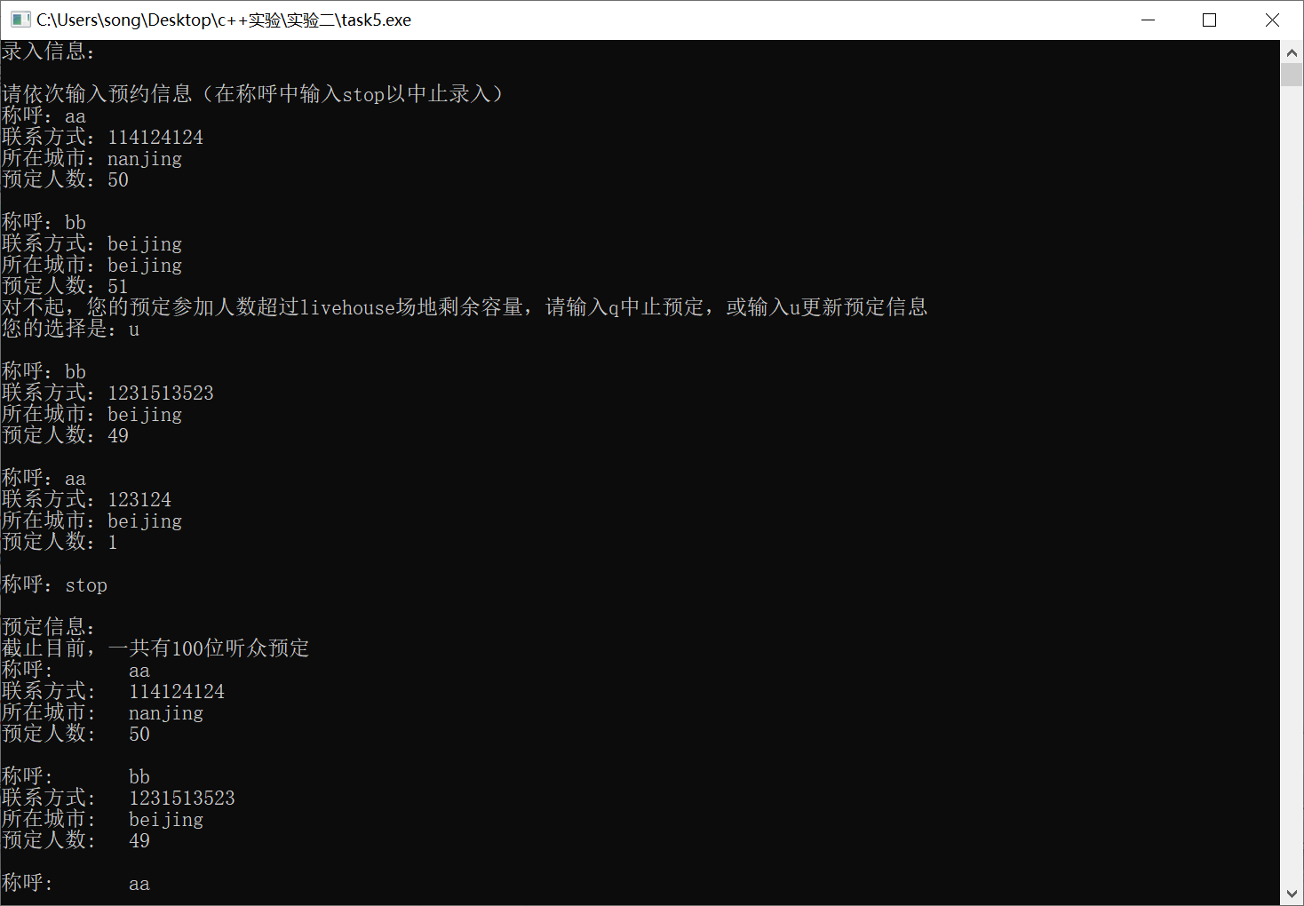 #include <string> #include <iostream> #include <vector> using namespace std; class Info{ public: Info(string nname,string co,string ct,int nn){ nickname = nname; contact = co; city = ct; n = nn; } void print(){ cout << "称呼: " << nickname << endl; cout << "联系方式: " << contact << endl; cout << "所在城市: " << city << endl; cout << "预定人数: " << n << endl; } private: string nickname; string contact; string city; int n; }; int main(){ vector<Info> audience_info_list; static int capacity = 100; cout << "录入信息:\n\n" ; string nickname,contact,city; int n; cout << "请依次输入预约信息(在称呼中输入stop以中止录入)\n"; cout << "称呼:"; cin >> nickname; while (nickname!="stop"){ cout << "联系方式:"; cin >> contact; cout << "所在城市:"; cin >> city; cout << "预定人数:"; cin >> n; if (n>capacity){ char a; cout << "对不起,您的预定参加人数超过livehouse场地剩余容量,请输入q中止预定,或输入u更新预定信息\n"; cout << "您的选择是:"; cin >> a; if (a=='q') break; else{ cout << "\n称呼:"; cin >> nickname; continue; } } Info audience (nickname,contact,city,n); capacity = capacity-n; audience_info_list.push_back(audience); cout << "\n称呼:"; cin >> nickname; } cout << "\n预定信息:\n"; cout << "截止目前,一共有" << 100-capacity << "位听众预定\n"; for (auto a : audience_info_list){ a.print(); cout << "\n"; } return 0; }