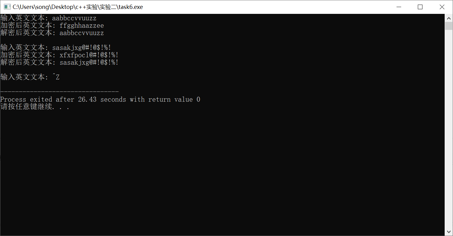 #include "textcoder.hpp" #include <iostream> #include <string> int main() { using namespace std; string text, encoded_text, decoded_text; cout << "输入英文文本: "; while (getline(cin, text)) { encoded_text = TextCoder(text).encoder(); // 这里使用的是临时无名对象 cout << "加密后英文文本:\t" << encoded_text << endl; decoded_text = TextCoder(encoded_text).decoder(); // 这里使用的是临时无名对象 cout << "解密后英文文本:\t" << decoded_text << endl; cout << "\n输入英文文本: "; } }