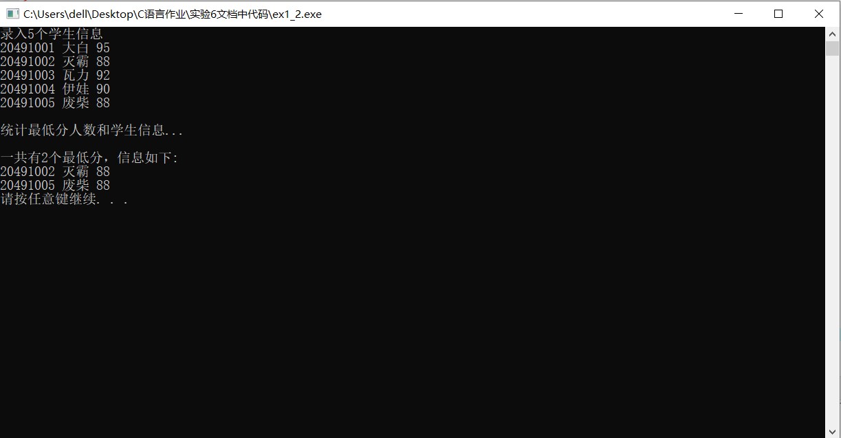#include <stdio.h> #include <stdlib.h> #include <string.h> const int N=5; // 定义结构体类型struct student,并定义STU为其别名 typedef struct student { long no; char name[20]; int score; }STU; // 函数声明 void input(STU s[], int n); int findMinlist(STU s[], STU t[], int n); void output(STU s[], int n); int main() { STU stu[N], minlist[N]; int count; printf("录入%d个学生信息\n", N); input(stu, N); printf("\n统计最低分人数和学生信息...\n"); count = findMinlist(stu, minlist, N); printf("\n一共有%d个最低分,信息如下:\n", count); output(minlist, count); system("pause"); return 0; } // 输入n个学生信息,存放在结构体数组s中 void input(STU s[], int n) { int i; for(i=0; i<n; i++) scanf("%ld %s %d", &s[i].no, s[i].name, &s[i].score); } // 输出结构体s中n个元素信息 void output(STU s[], int n) { int i; for(i=0; i<n; i++) printf("%ld %s %d\n", s[i].no, s[i].name, s[i].score); } // 在结构体数组s中,查找最低分学生的记录,将其存入结构体数组t中 // 形参n是结构体数组s中元素个数 // 函数返回最低分的学生人数 int findMinlist(STU s[], STU t[], int n) { int i,j,k=0; STU temp; for(i=0;i<n;i++) for(j=0;j<n-1-i;j++) if(s[j].score>s[j+1].score) { temp = s[j]; s[j] = s[j+1]; s[j+1] = temp; } for(i=0;i<n;i++) if(s[i].score==s[j+1].score) { t[k++]=s[i];} return k; }