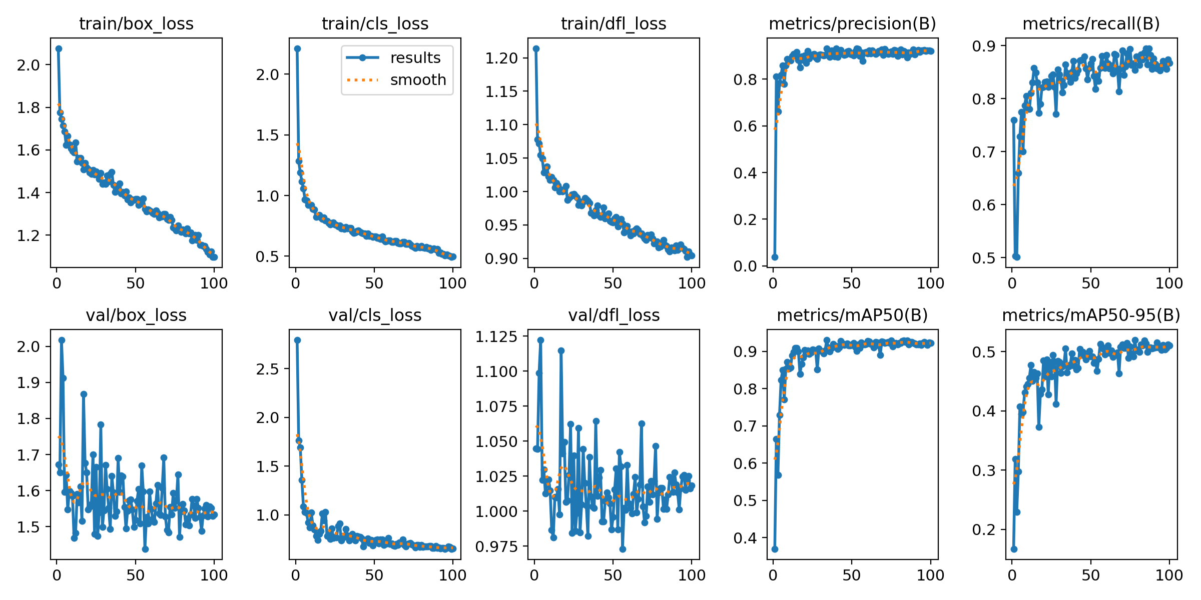 首先,训练和验证损失(train/box_loss, train/cls_loss, train/dfl_loss, val/box_loss, val/cls_loss, val/dfl_loss)图表显示了模型在各个方面的性能。损失图的下降趋势表明模型正在逐渐学习识别数据集中的特征和模式。特别是,在早期训练阶段,损失的快速下降表明模型快速适应了训练数据。在后期,损失曲线的平缓化则可能表明模型接近于其学习能力的极限,这时模型的改进可能只会以较慢的速度进行。训练损失与验证损失之间存在一定的差异。如果验证损失相比于训练损失较高,这可能是过拟合的迹象,意味着模型可能在训练数据上表现得过好,而无法有效泛化到未见过的数据。然而,这种差异也可能只是由于验证数据固有的难度较高或分布与训练集略有不同。