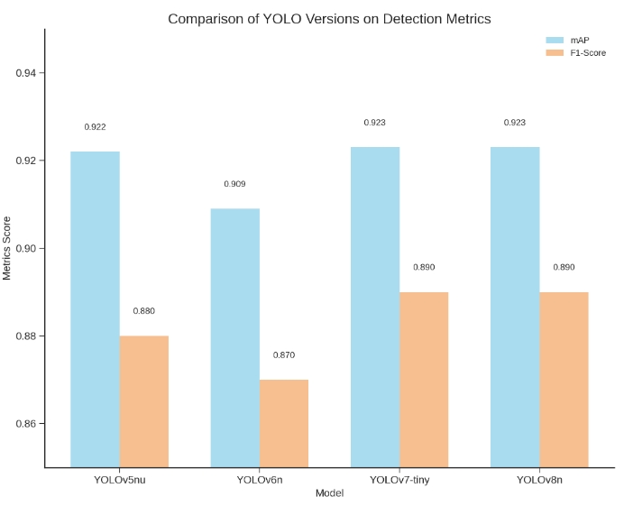 这样的性能表现可能归功于不同模型版本中改进的网络架构和优化算法。例如,YOLOv7-tiny虽然是轻量级设计,但它可能在特征提取和锚点策略上进行了特别的优化,使其在小目标的检测上更为精准。而YOLOv8n可能在继承前代YOLO模型优点的同时,进一步强化了对复杂背景和小尺寸目标的识别能力。同时,我们还应当注意到,尽管YOLOv6n在这两个指标上的表现略逊一筹,但它的结果仍然表现出较高的水平,这表明其在通用目标检测任务上具有可靠的性能。此外,这也可能表明在实验设置或数据集构成上存在着可以进一步优化的空间,例如通过数据增强或进一步的超参数调整来提升性能。