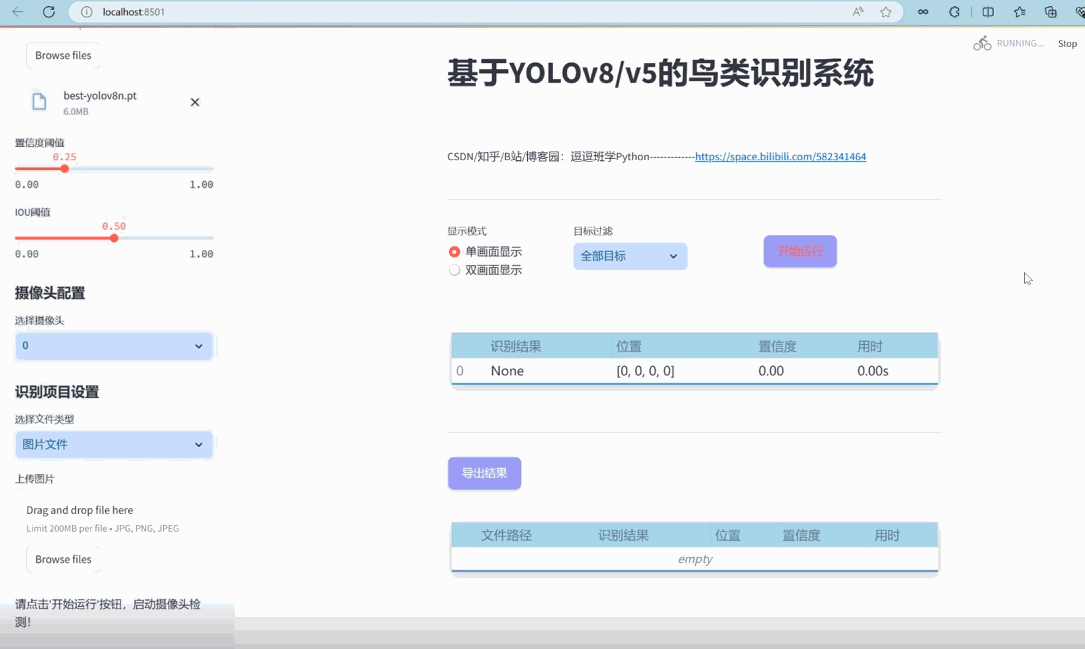 基于Streamlit的网页设计:选择Streamlit作为网页应用框架,结合CSS进行界面美化,提供了一个直观且功能丰富的用户交互平台。用户可以轻松上传图片、视频或直接通过摄像头进行实时鸟类识别,同时支持切换不同的模型文件,以满足不同的使用需求。