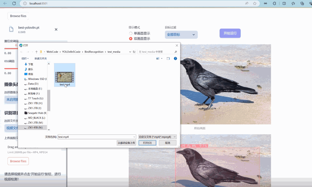 (3)选择视频文件检测:系统支持用户上传视频文件进行鸟类识别。上传的视频将被系统逐帧分析,以识别和标记视频中每一帧的鸟类。用户可以观看带有鸟类识别标记的视频,了解视频中鸟类的变化。