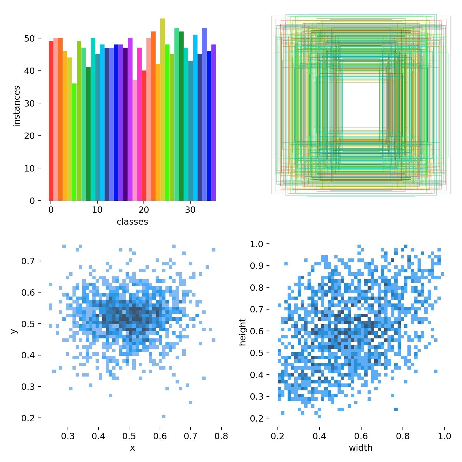 我们的数据集还展示了边界框中心点的集中趋势和宽高比的分布,揭示了在图像中心区域鸟类出现的可能性更高,以及在不同大小和形态的图像中,鸟类的宽度和高度比例变化很大。这些分析结果对于训练阶段锚框的选择、模型架构的设计,以及后续的性能优化都有直接的指导意义。