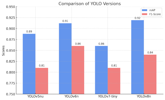 根据实验结果,YOLOv5nu、YOLOv6n、YOLOv7-tiny和YOLOv8n在mAP评估指标上的得分分别为0.888、0.912、0.860和0.919,而在F1-Score上的得分分别为0.81、0.86、0.81和0.84。显而易见,YOLOv8n在mAP上表现最好,这意味着它在平均精度上超越了其他模型,尤其是在不同置信度阈值下保持了较高的准确率。这种高水平的准确性可能源自YOLOv8n在特征提取、背景抑制以及锚框优化方面的进步。