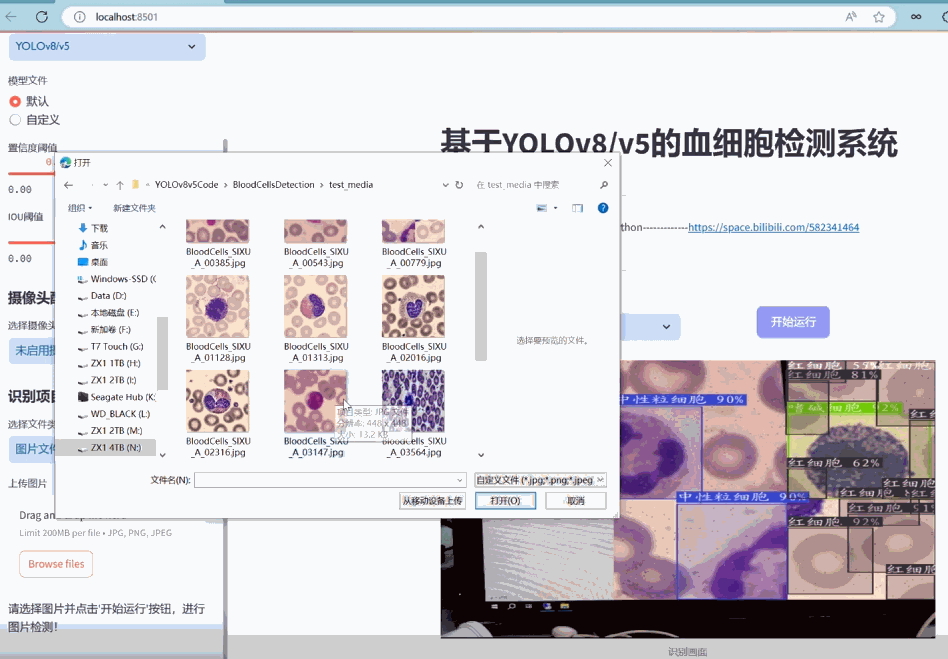 (2)选择图片检测:用户可以上传本地的图片文件到系统中进行血细胞检测。系统会分析上传的图片,识别出图片中的血细胞,并在界面上展示带有血细胞标签和置信度的检测结果,让用户能够清晰地了解到每个血细胞状态。