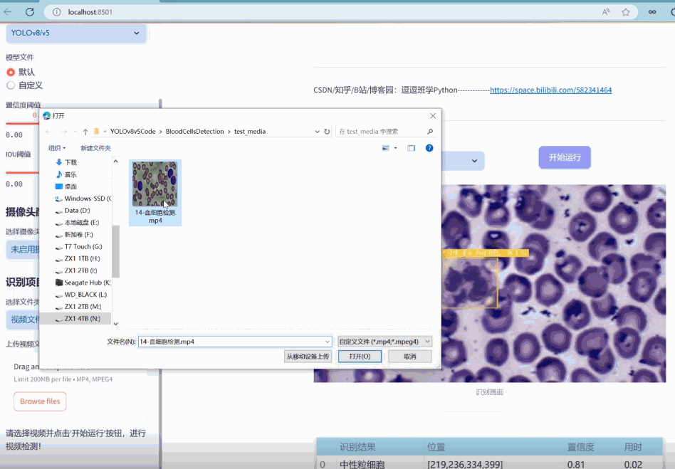 (3)选择视频文件检测:系统支持用户上传视频文件进行血细胞检测。上传的视频将被系统逐帧分析,以识别和标记视频中每一帧的血细胞。用户可以观看带有血细胞检测标记的视频,了解视频中血细胞的变化。
