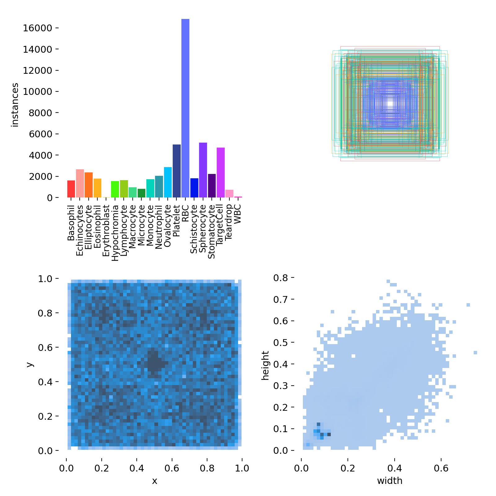 进一步的分析还包括了标注框尺寸和位置的详细视图。从位置热力图中,我们注意到标注框大多集中在图像的中央区域。这一模式强调了在训练模型时对图像中心区域特征提取的重要性。同时,尺寸分布图表明了血细胞的标注框主要集中在较小尺寸区域。这提醒我们,在设计检测模型时,需要特别关注对小尺寸目标的识别能力,可能需要采用多尺度检测技术来确保对不同尺寸血细胞的有效检测。