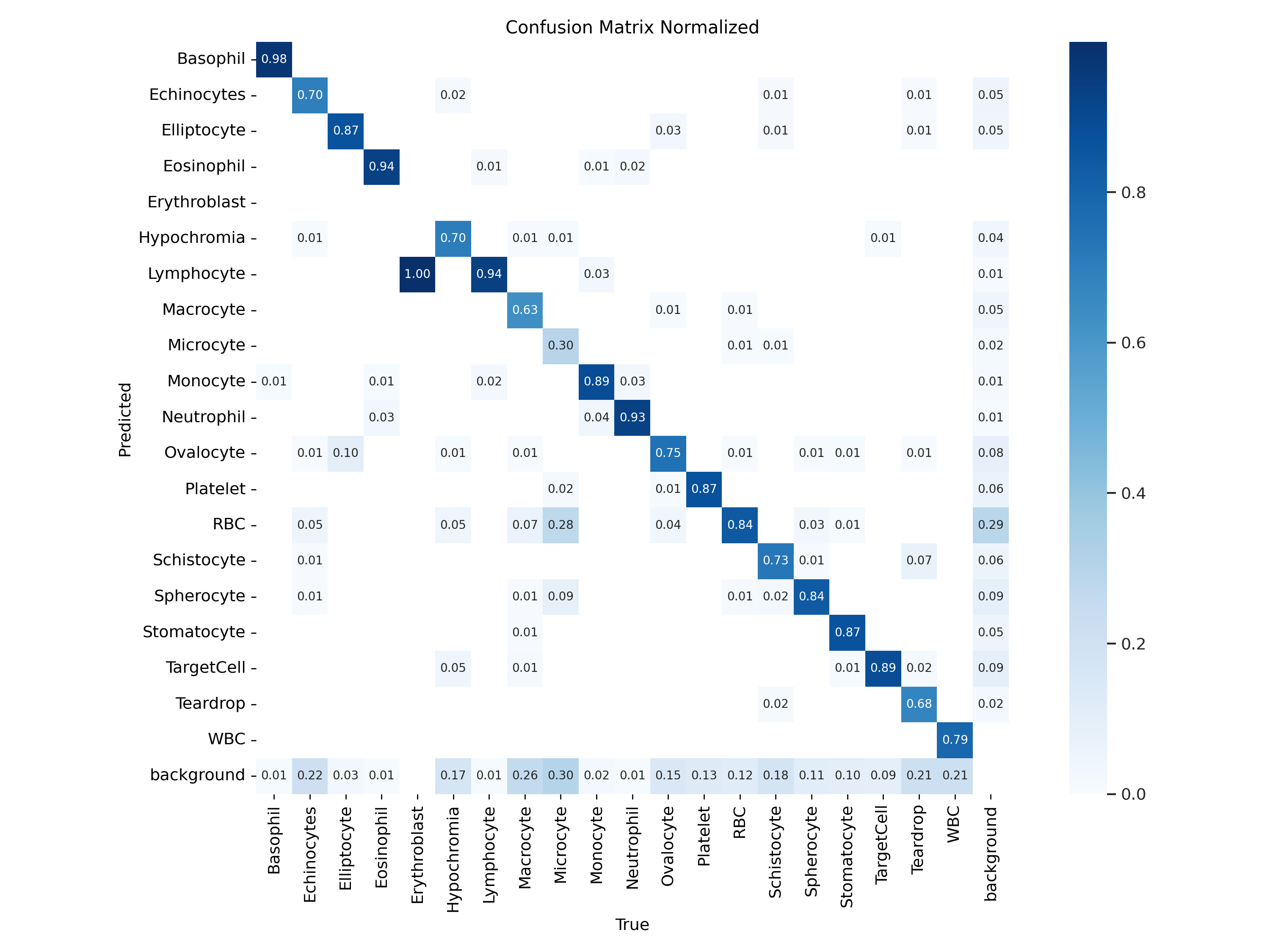 然而,也有一些类别的准确率较低,如Erythroblast 和 Microcyte,其准确率分别为0.70 和 0.30。这可能是由于这些类别的样本量较少,或者它们的特征不够鲜明,导致模型难以进行有效区分。此外,对于那些易于与其他类别混淆的血细胞类型,混淆矩阵还揭示了它们主要与哪些类别发生混淆。例如,RBC类别与其他几个类别存在一定程度的混淆。