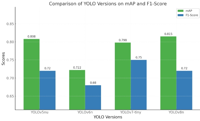 从实验结果可以看出,YOLOv8n在mAP指标上表现最佳,达到了0.815,而在F1-Score指标上与YOLOv5nu持平,均为0.72。这表明YOLOv8n在检测准确性上略胜一筹,可能是因为YOLOv8n在网络架构和特征提取方面进行了优化,提高了模型对血细胞各类特征的识别能力。相比之下,YOLOv6n在两个指标上的表现都稍微逊色,这可能是因为YOLOv6n在处理这一特定数据集的某些特征时不够鲁棒,或者模型的训练过程中没有完全收敛。YOLOv7-tiny在F1-Score上的表现最佳,达到了0.75,尽管其mAP稍低。较高的F1-Score表明YOLOv7-tiny在精确度和召回率方面取得了良好的平衡,特别是在有限的计算资源下。这个结果表明,对于需要在资源受限的环境下部署的应用,YOLOv7-tiny可能是一个更合适的选择。