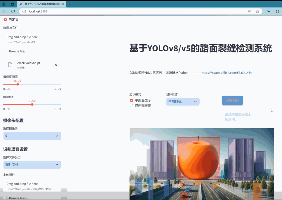 为了确保用户能够高效地利用本系统进行路面裂缝检测,我们开发了基于Streamlit的直观交互式网页界面。该界面不仅美观,而且用户友好,通过CSS美化进一步提升了视觉效果和用户体验。界面设计考虑了实用性和功能性,支持图片、视频及实时摄像头的裂缝检测,同时允许用户轻松切换不同的模型文件,以及调整检测参数,如置信度阈值和IOU阈值。