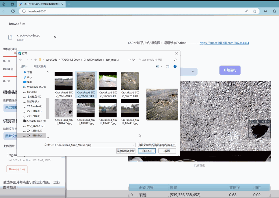 (2)选择图片检测:用户可以上传本地的图片文件到系统中进行路面裂缝检测。系统会分析上传的图片,识别出图片中的路面裂缝,并在界面上展示带有路面裂缝标签和置信度的检测结果,让用户能够清晰地了解到每个路面裂缝状态。