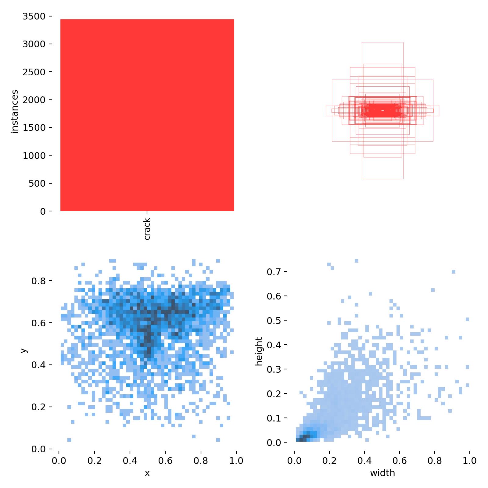 我们的数据集在标注上展现出了高度的专业性。每个裂缝实例都精确标记,以便模型能够学习如何准确地定位和识别裂缝。由分布图表可见,裂缝的位置主要集中在图像的中心区域,这反映了道路中央裂缝的普遍性。然而,我们也观察到不少裂缝分布在图像边缘,提示我们在模型训练时需注意到这些边缘情况,以提高模型在实际道路环境中的应用能力。