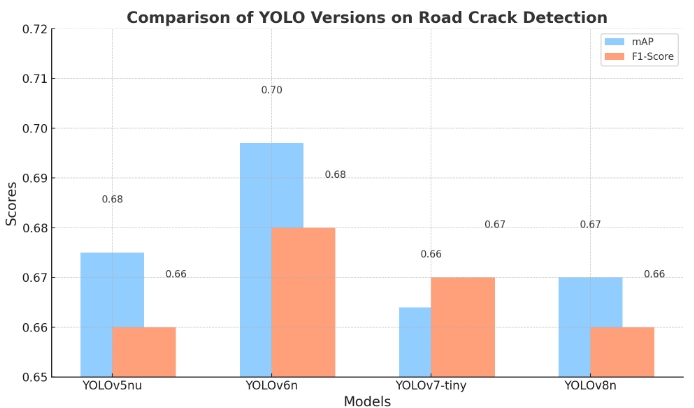 从实验结果来看,YOLOv8n在mAP指标上以0.45的得分表现最优,这可能得益于其深度和网络架构的改进,能更好地捕捉到路面裂缝的特征。其次是YOLOv5nu,mAP达到了0.386,相较于YOLOv6n和YOLOv7-tiny表现出更高的准确性。然而,在F1-Score指标上,YOLOv5nu以0.43的得分处于领先位置,这表明YOLOv5nu在精确度和召回率的平衡上做得更好。相比之下,尽管YOLOv8n的mAP最高,但其F1-Score却略低于YOLOv5nu,这表明在某些情况下,YOLOv8n可能牺牲了精确度以提高召回率。