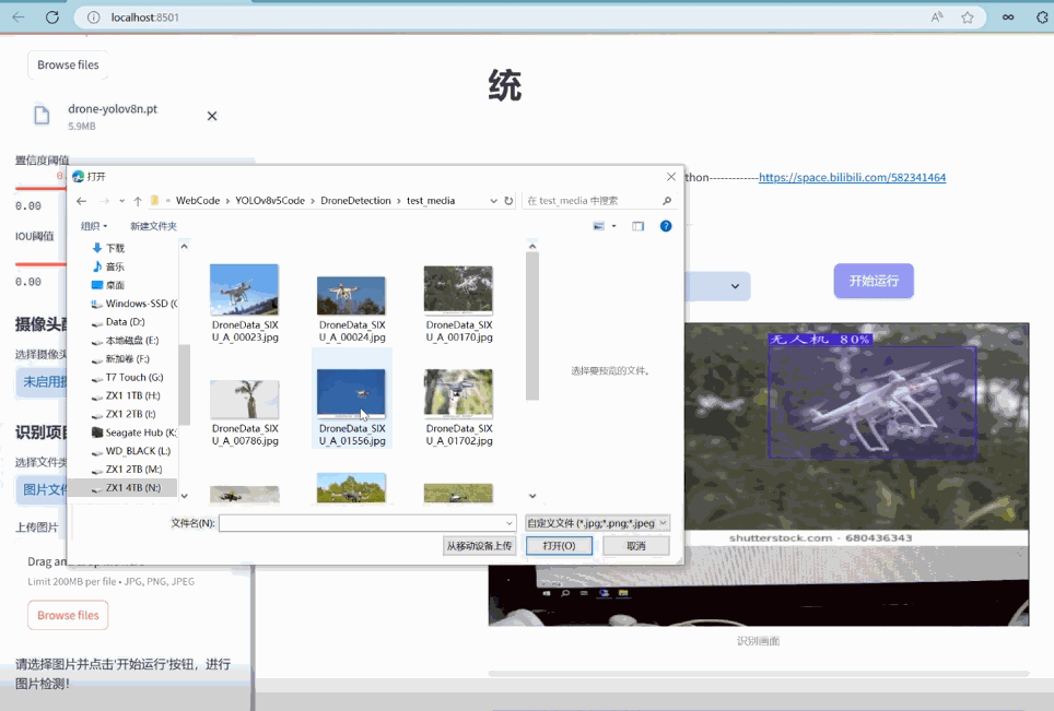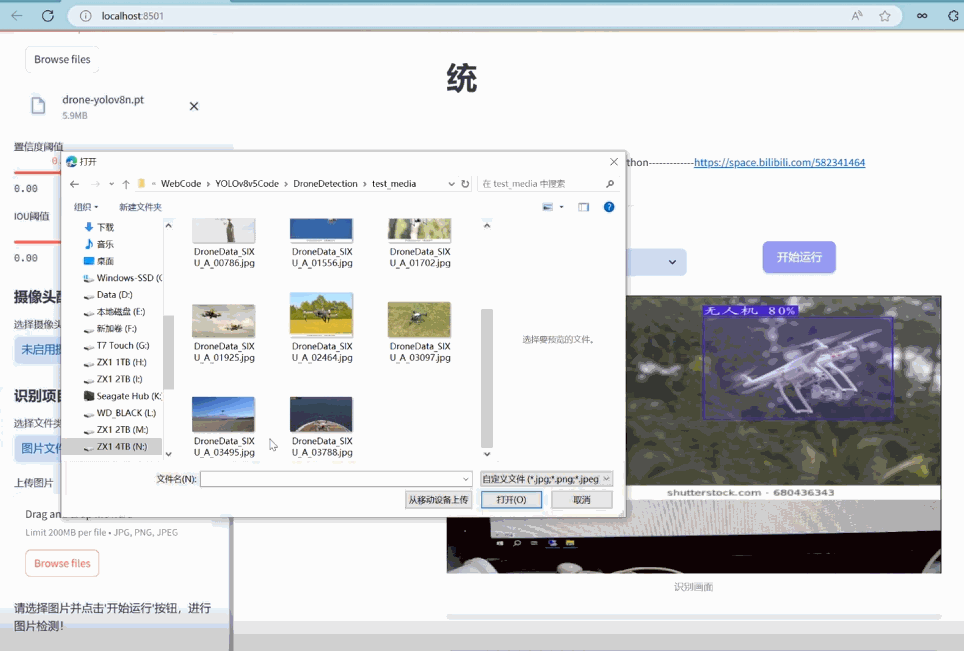 (2)选择图片检测:用户可以上传本地的图片文件到系统中进行无人机目标检测。系统会分析上传的图片,识别出图片中的无人机目标,并在界面上展示带有无人机目标标签和置信度的检测结果,让用户能够清晰地了解到每个无人机目标状态。