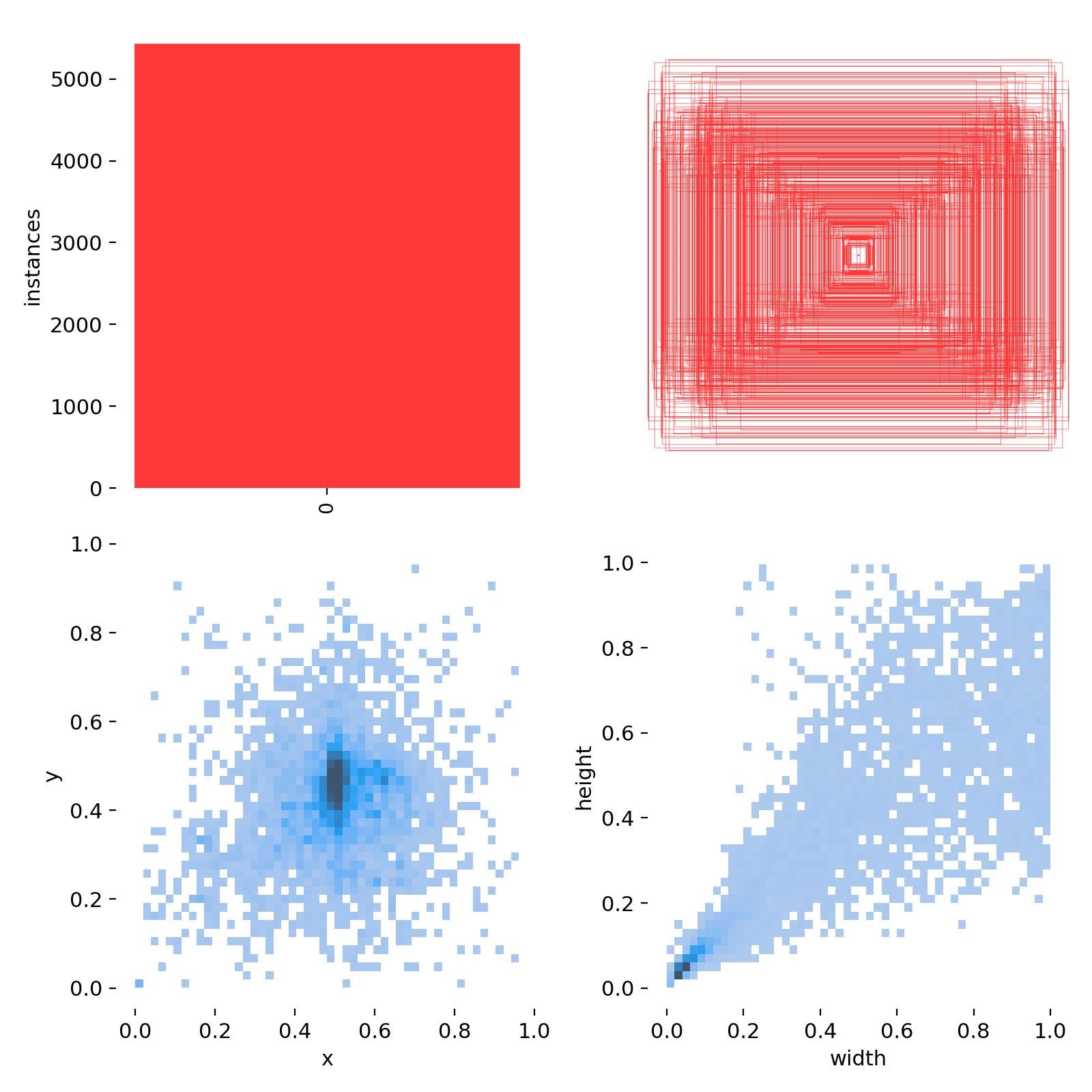 从数据集的分布图中,我们可以观察到有关目标(无人机)在图像中的相对位置、大小和形状的信息。具体来说,第一张图是一个纯色图,似乎是为了标示数据集总量的一个占位符;第二张图显示了所有目标框的叠加,表明大部分无人机在图像中的位置倾向于中心区域,这可能是由无人机拍摄角度倾向于正对目标导致的;第三张和第四张图则提供了目标框在x-y平面的分布情况和目标框的宽高比例,显示出目标大小多样性和一定的集中趋势。这些分析结果对于调整我们的目标检测算法在检测框预测方面的策略是非常有用的,因为它揭示了目标在图像中的一般分布情况,我们可以据此对模型进行优化,比如在模型的锚框设置上给予更多关注中心区域和常见的宽高比例。