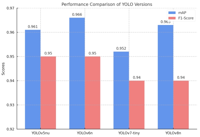 另一方面,F1-Score作为精确率和召回率的调和平均,能够衡量模型在保持较低误报率的同时是否还能准确地识别出所有正类样本。实验结果中,YOLOv5nu和YOLOv6n均以0.95的F1-Score并列第一,表明这两个模型在平衡精确率和召回率方面做得很好。而YOLOv7-tiny和YOLOv8n以0.94的F1-Score略低,这可能意味着它们在检测某些正类样本时表现不够理想或者在某些情况下产生了更多的误报。